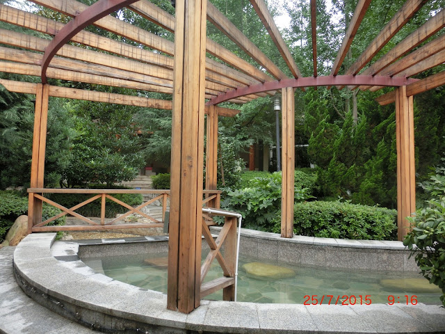 (¥38),國色池、天香池,熱石板等。0918到林語曉澗區,有蘆薈池、紅酒池、醋池、艾葉池、荷葉池等。0921 鹽療坊,鹽浴要收費,0923 到滑道,但要1100 才開放。0926 到海浪池,旁是水簾洞天區,有薑池、茶池、苿莉花池等;溫泉區內大部份溫泉池還在清洗/未放水,但全部溫泉池我也沒時間下水泡浸,祇能匆匆拍照。0928 到泳池,服務員說要戴泳帽才能下水,我沒有帶備,又沒有時間回房取,最後服務員借一頂給我用 (是舊的) ,服務很不錯。0938 匆匆回房沖洗,收拾行理。