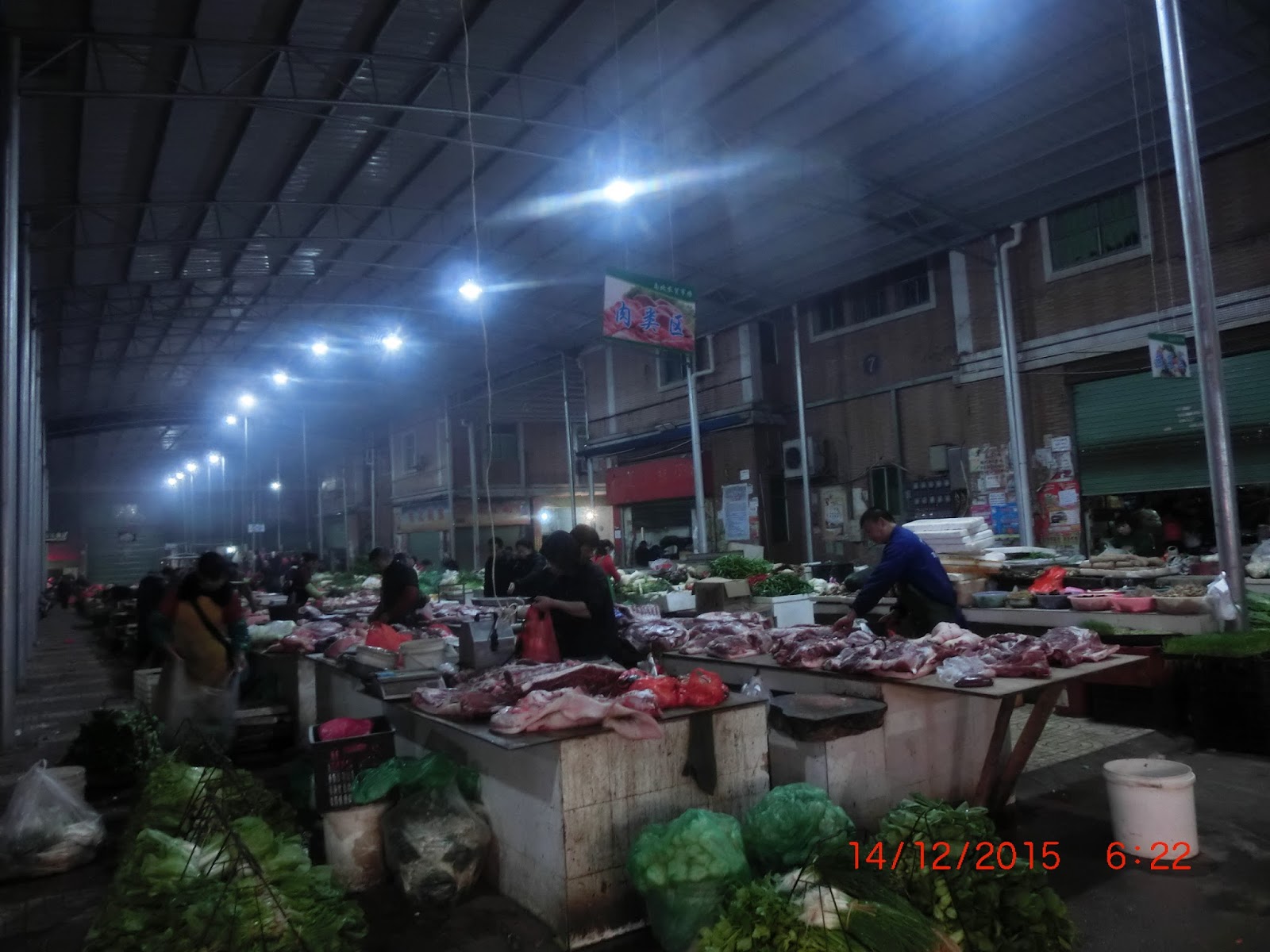 2015 年 12 月 14 日,星期一,氣溫 9 ºC,0610 出外晨運。沿酒店前馬路右行,0618 到市場外的攤檔,剛到達時還有街燈,約3 分鐘後便熄街燈,市民要手持電筒買菜。前行少許到「南北農貿市腸」,面積頗大,菜/肉攤檔已經開始營業;0622 到鹵味/燒味檔,燒鴨正在烤烘,師父說0700 才燒熟;前行到另一間店,老闆娘說0630 會有燒鴨買,叫我轉頭再來購買。0629 到水果區,店舖和路中心都有很多滾筒炒粟子機