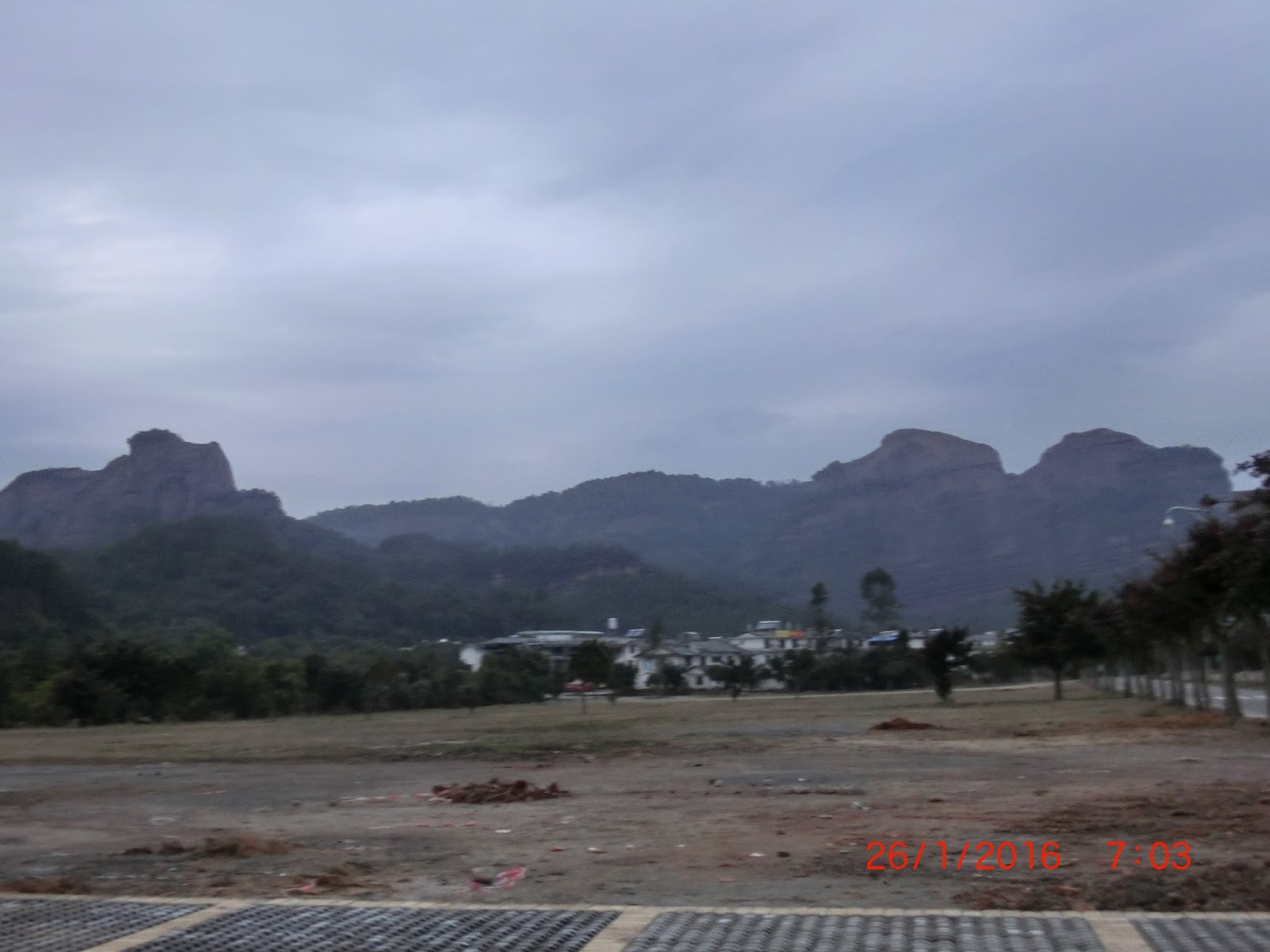 2016 年 1 月 26 日,星期二,氣溫 3ºC ,微雨。0605 出外晨運,沿酒店旁大路前行到丹霞山景區,進入景區是不用檢票,如要登長老峰 (另外加購索道票) ,及到陽元山等景點才要檢票。沿途街燈昏暗,一片漆黑,要用電筒照明前行。0626 到民宿/客棧,前行有遊客中心。0700 天邊呈現魚肚白色,可觀賞少許丹霞山層巒疊翠,峻峭山景。0710 沿路折返,0730 返回景區大門口。0739到餐廳用自助早餐,食物有:白粥、豆漿、番薯、粟米、糉、包、饅頭、油條、炒麵、炒米粉、大白菜、雞蛋等。0820 離開,0830 到酒店後山的溫泉區,已建有數個溫泉池,但荒廢/停工很久,周圍佈滿泥濘,建築廢料,是一個 “爛尾溫泉” 。0840到丹霞山票務中心,門票 ¥150,60-69 歲半價,70 歲以上免票,包含長老峰、陽元山等景區。0855 返回房間收拾行理。0945 退房,1000 開車離開。