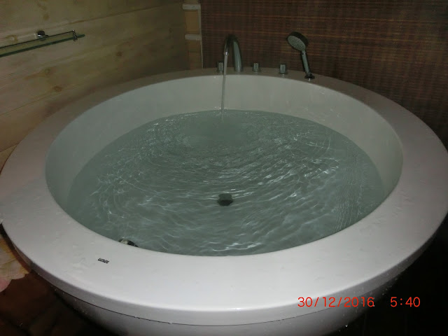 2016 年 12 月 30 日,星期五,0530 在房間溫泉池泡浸,出水比較慢,要放大半個鐘頭水才滿,水夠熱,水溫剛適合,不用灘涼/混和冷水;寧靜地享受浸溫泉的樂趣,泉水是稀有的氡溫泉水,清澈透明、晶瑩爽滑,泡浸完後身心舒暢,精神抖擻 !0625 出外晨運,沿度假村前大路前行,0650 到南湖村,有豬肉檔 (¥10/斤) 。前行到九連山溫泉度假山莊、南湖東岸溫泉別墅路口,再沿小路前行,0700 到木屋別墅排,客房內有“私家天窗溫泉池” (滙景有主辦此線路) ;但如要享用公眾溫泉大池及用餐,便要乘接駁車/步行到熱龍溫泉度假村 (是聯營的) 。0709 到龍宮,建在河畔的簡陋景點,有龍頭、龍神之位及龍門。河畔有泉眼,水氣瀰漫、熱霧裊裊、河水燙熱,見有雞檔檔主在河邊劏雞《 (¥60/隻) 以前住過九連山見很多師奶都會購買數隻雞帶回香港》。0735 到餐廳用自助早餐,客人十分擠擁,因有數車住在九連山溫泉的團友剛到,食物有:白粥、黃豆排骨粥、豆漿、咖啡、唐生菜、冬瓜、炒米粉/麵、魚腐、腸粉、粟米、雞蛋、糯米雞、燒賣、番薯、芋頭、豬紅等;雖然客人很多,但補充頻密。0835 離開。