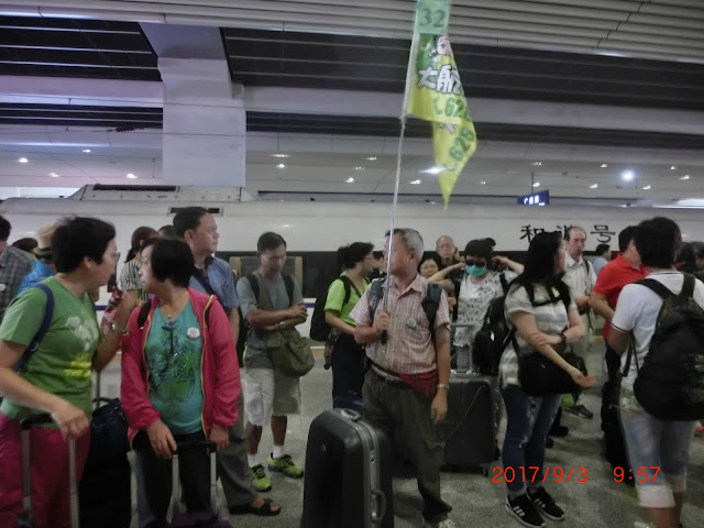 “追團” ,滙合導遊/取車票 (其實最多等15 分鐘便要出發,其他規模細小的旅行社是沒有職員帶遲到的團友去“追團”的,應給那些遲大到的團友一個教訓!) 》。0728乘地鐵 “龍華線” ,0751 到深圳北站,小平祇分派到廣州南站的高鐵票,說恐防團友混淆 (到 “貴陽北” 的動車票其後在車上才分派) 。0758 經檢票証、安檢到候車大廰。團隊乘 G6218 班次到廣州南站,0920 開、車費 ¥74.50 。0900 到檢票閘口排隊入閘,向導遊打探得悉早前遲到的10 多位團友已經及時趕到 《小平說在檢票証閘口 (安檢前) 附近 “拋擲” 車票給“追到團”的團友入閘
