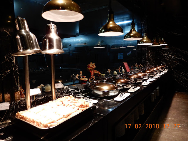 1730 到餐廳享用自助晚餐,海鮮自助餐+鴛鴦火鍋,是第一次在酒店自助餐中可以有雙重享受。食物款式很多,海鮮/日式刺身有:三文魚、鯛魚、希靈魚、吞拿魚、八爪魚、凍蝦、帶子、翡翠螺、蜆、花甲、花蟹、生蝦、炭燒生蠔、壽司等;鐵板燒有:牛扒、豬扒、雞扒、鯧魚、紅衫魚、多春魚等;熱薰有:洋蔥炆牛尾、燴鹿肉、三文魚骨腩、蘿蔔炆牛腩、鮮魷、白切雞、蔬菜等;火鍋配料有:美國肥牛卷/新西蘭羔羊肉卷/梅花鹿卷