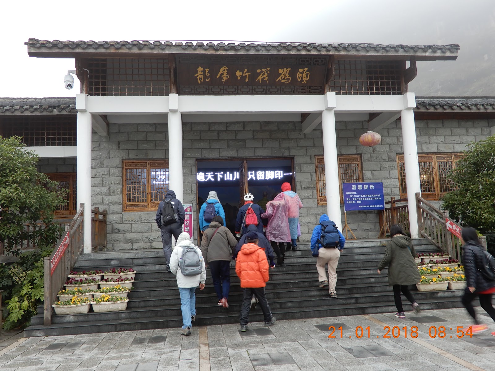 導遊派送每位團友一件兩衣。0816 到遊客中心,有道教館,地質館,館內有簡介 “千年之謎崖墓懸棺” ,展廰內擺放兩具完整無缺的男/女乾屍,可惜沒有時間進入參觀。0824 到龍虎山觀光車站,5 車團友在此映大合照留念。0832