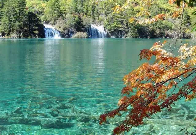 0948 車遊蘆葦海,0955 到雙龍海下車遊覽。雙龍海瀑布海拔2180米,在火花海瀑布下的樹叢中。海中有兩條帶狀的生物鈣華礁堤,隱隱潛伏於海底,活像兩條蛟龍藏於海中,蠕蠕欲動,仿佛隨時要騰空而起。故名。雙龍海曾經並沒有瀑布景觀,原掩藏在密林深處;2017 年 ”8.8” 九寨溝 7.0 地震後,造成了火花海潰壩,大量的海水流出,露出乾涸的湖面,而火花海流出的水,造就了新的景點——雙龍海瀑布。1015 離開。