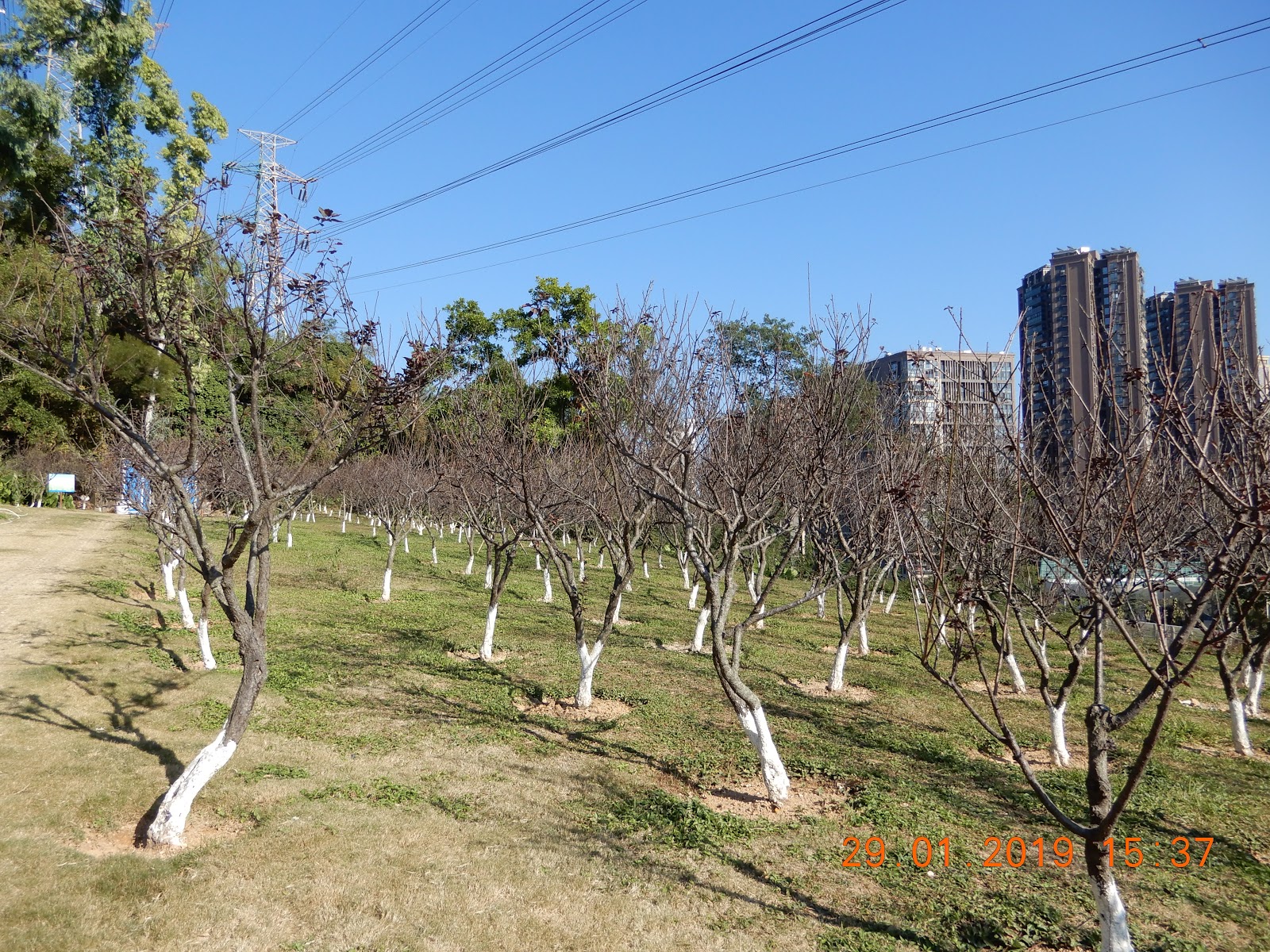 梅園位於北環大道香蜜立交西北側,坐落在梅林山北邊坡,面積2萬平方米,免門票。梅花品種有 : 潮塘宮粉、桃紅宮粉、美人梅、朱砂梅和綠萼梅等5種梅花,共計4000多株。梅花除遍植在園林廣場外,沿山路也滿佈,如梅花林海。紅梅綻放、爭妍鬥麗、燦爛芬芳、清雅脫俗、令人陶醉。梅園裡的花花期不同,1-2月份是潮塘宮粉、桃紅宮粉和綠萼梅的主場,2月下旬至3月初美人梅和朱砂梅才會登場。當天見梅園的梅花大部份還沒有完全盛開,很多都還處於含苞待放的狀態,要約下星期,或春節後才燦爛綻開。那天雖然是平日,但賞梅的遊人很多,見有些更穿著古裝,帶備道具︰油紙傘、羽扇等在梅林中取景拍照。1555 離開,循到來的路線返回“橋香”
