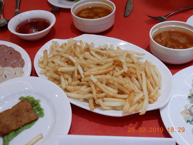 1800 到宴會廳享用晚餐,中俄式西餐,食物有︰羅宋湯、沙律、雞脾搥、燴雞、餃子、薯條、香腸、炸魚圈、麵包等,十分差劣、難食,不飽的晚餐。《有3 位團友自行乘的士到滿洲里市區、車費